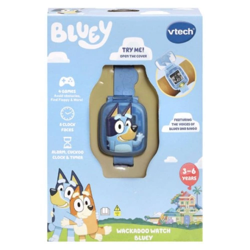 Нека играем с Bluey, Bingo и часовника Wackadoo! Този ръчен часовник за деца с участието на Bluey включва осем цифрови циферблата, инструменти за време и четири игри. Чуйте гласовете на Bluey и Bingo, които ви водят през игри, включващи герои от сериала.