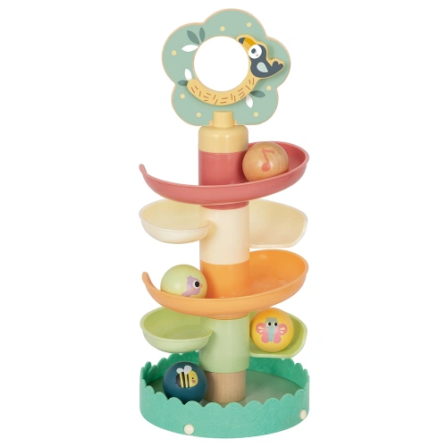 Играчката включва 6 сглобяеми части, които образуват спираловидна кула, и 4 цветни топчета, всяко изрисувано с различни животни и музикални ноти. Когато топчето бъде пуснато от върха, детето с интерес ще проследи как то се търкаля надолу по пистата, издавайки нежни звуци и създавайки усещане за ритъм и движение.