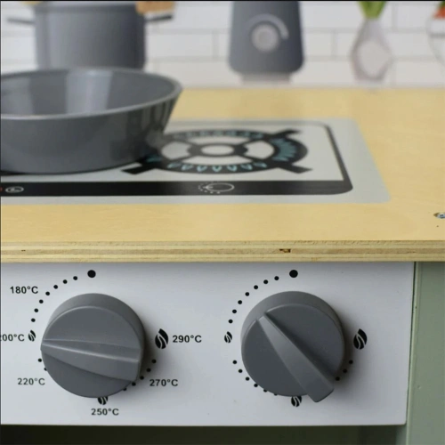 Комплектът включва фурна, котлони и мивка, заедно с дървени и пластмасови аксесоари – тенджера, тиган и кухненски прибори, които превръщат всяка игра в истинско кулинарно приключение. Работният плот и отворените рафтове осигуряват удобно място за подреждане на всички „съставки“, докато четирите здрави дървени крака гарантират стабилност и безопасна игра.