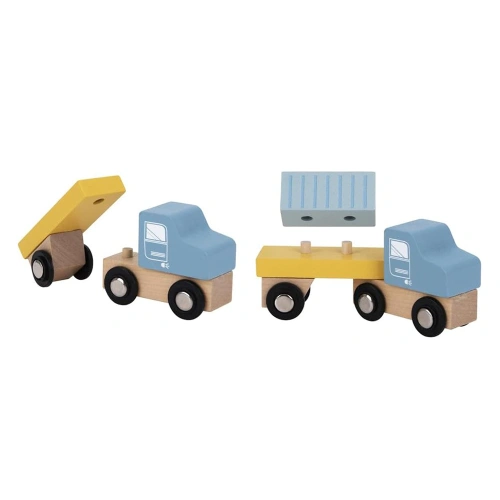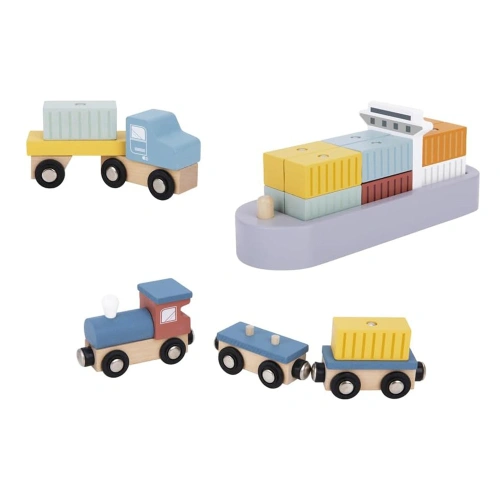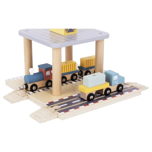 Комплектът създава цяла миниатюрна пристанищна сцена, в която всяко дете може да поеме ролята на кранов оператор, влаков диспечер или шофьор на камион.