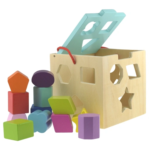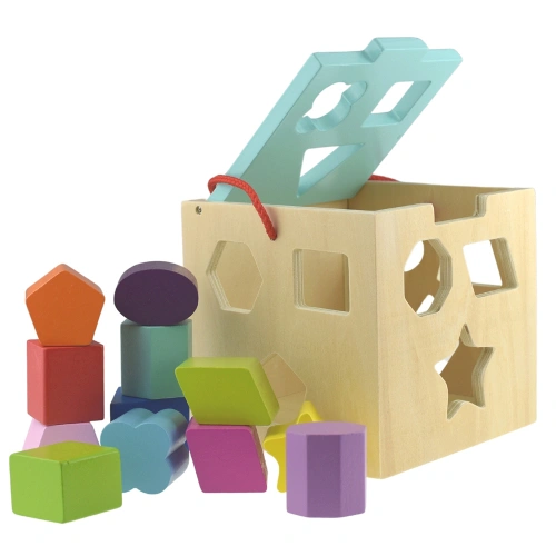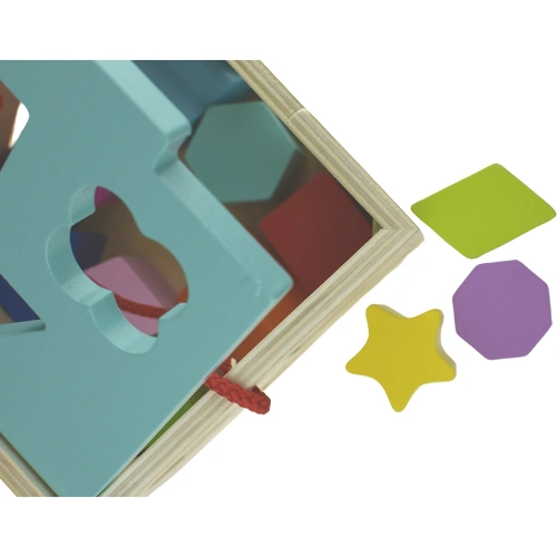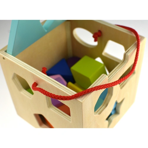 Изработен от висококачествен дървен материал, сортерът е оцветен с безопасни, нетоксични бои, което го прави напълно подходящ за деца. Здравата конструкция гарантира дълготрайна употреба, а гладката повърхност и заоблените ръбове осигуряват безопасност по време на игра.