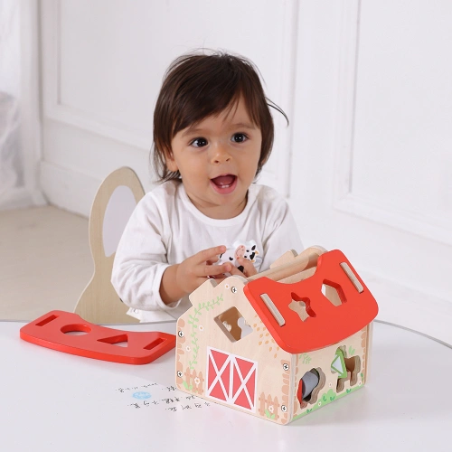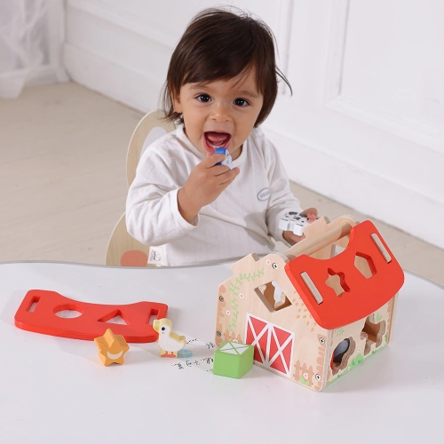 Открий света на формите и животните с очарователната дървена ферма-сортер от Tooky Toy!