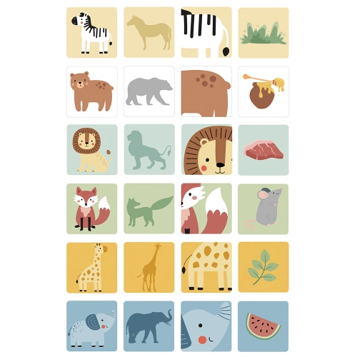 • 78 дървени блокчета с гравирани животински изображения (лъв, слон, жираф, маймуна и др.);