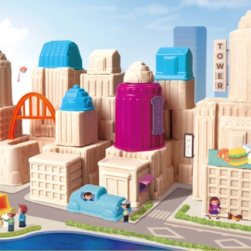 Комплектът съдържа 19 части, включително 16 цветни инструмента и форми – мостове, калъпи за сгради и строителни аксесоари, както и 2 превозни средства (самосвал и багер) в произволни цветове, които добавят реализъм към всяка игра. С тях децата могат да „транспортират“ материали и да изграждат своя собствена пясъчна площадка.