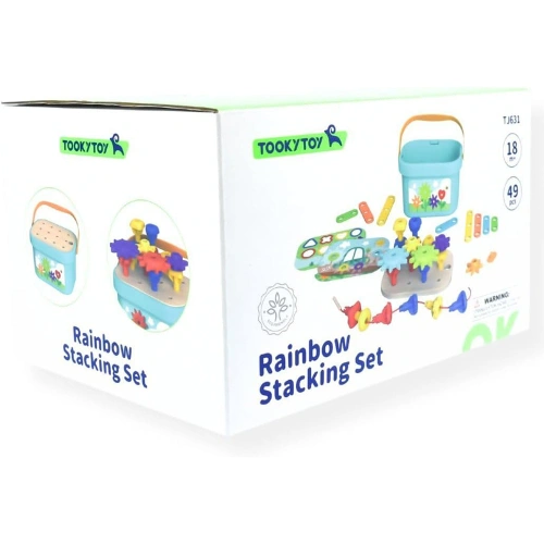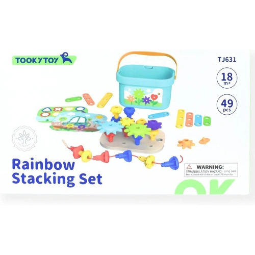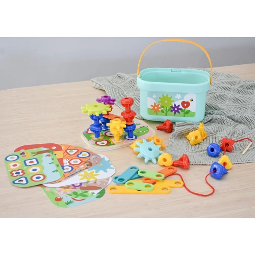 Комплектът съдържа 49 части, включително цветни пластмасови пинчета, зъбни колела и свързващи елементи, които предлагат безброй възможности за редене, нанизване, подреждане и изграждане на различни фигури и модели. Благодарение на трислойната дъска с отвори и картите с примери, децата могат да учат чрез игра, като развиват фина моторика, логическо мислене, пространствено въображение и основни инженерни умения.