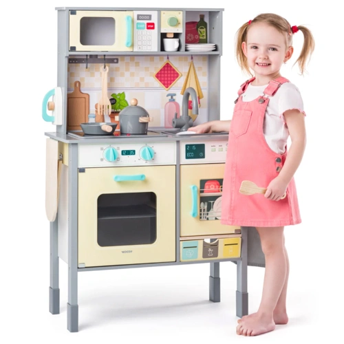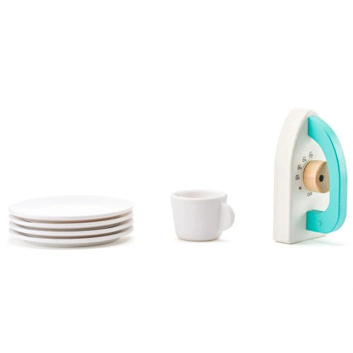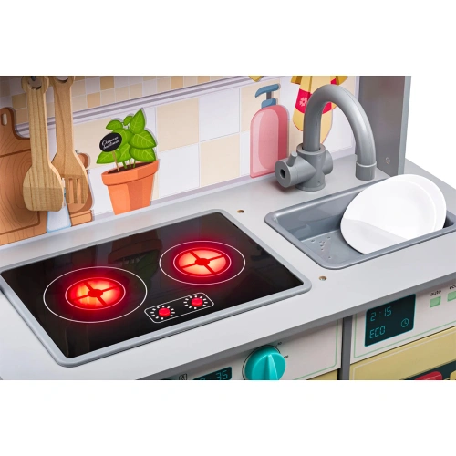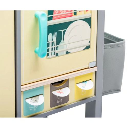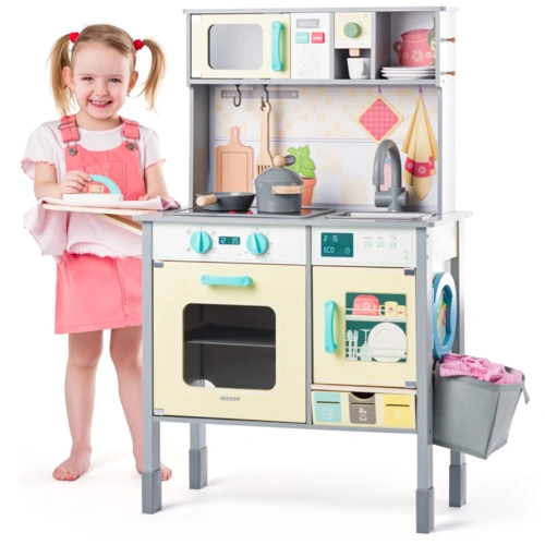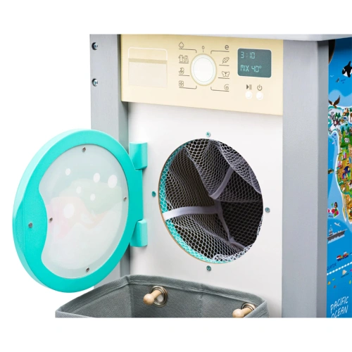 Освен кухня и котлони Вашите малчугани ще могат да се насладят на ролева игра с мивка, миялна машина, микровълнова печка, кафе машина, пералня и дори черна дъска за писане.
