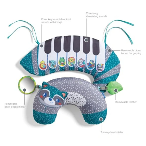 Очарователна и функционална бебешка възглавница във форма на сладък енот, създадена да подпомага развитието на бебето по време на игра по корем(tummy time). Благодарение на ергономичния си дизайн и включените сензорни играчки, тя стимулира двигателните умения, сетивното изследване и стабилизирането на мускулите на врата и горната част на тялото.