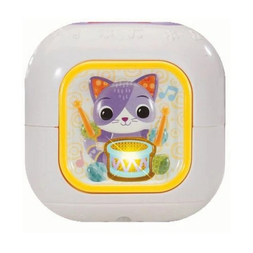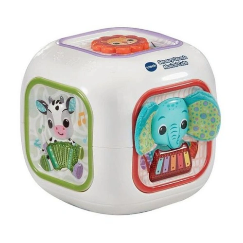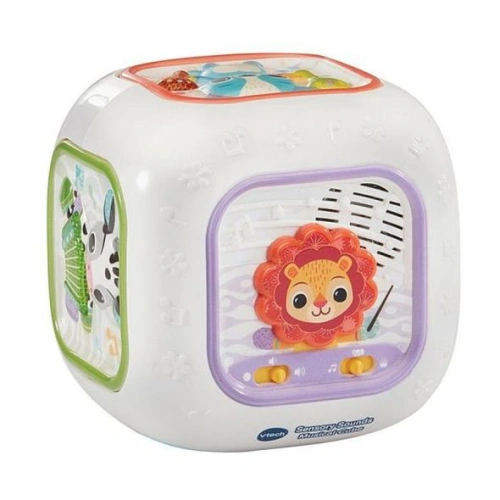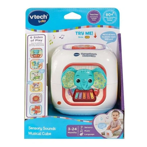 Присъединете се към животинския оркестър с музикалния куб Sensory Sounds от VTech! Всяка страна е с различно животно и инструмент, готови за свирене! Започнете музикалното пътешествие на бебето с весели детски песнички или класическа музика, след което малчуганите могат да създават своя собствена музика! Всеки инструмент от четирите страни може да бъде добавен към всяка забавна песен или да се свири самостоятелно с едно натискане на бутон. Добавете и четирите инструмента заедно, за да създадете закачливи ритми, след което се забавлявайте свободно, като добавите пищялка на лисица и щракваща лъвска глава! Меките слонски уши и заоблените ъгли на куба добавят допълнително сензорно откритие.