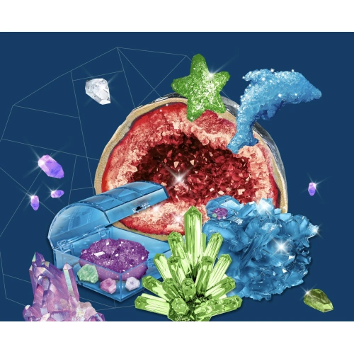 Отгледайте десетки ослепителни кристали и проведете 15 светещи експеримента с този класически научен комплект. Експериментирайте с четири различни кристала, всеки от които има различни свойства, включително кристали от калиево-алуминиев сулфат, които образуват правилни октаедри, бързо растящи кристали от натриев сулфат, дълги игловидни кристали от натриев ацетат и гипс, който е направен от гипсови кристали. Създайте забавни форми от гипс, включително звезди, светкавици, делфини и пирамиди, и отглеждайте върху тях слоеве от кристали. Използвайте багрила и ги смесвайте, за да създадете дъга от нестандартни цветни кристали. Изложете кристалните си творения в прозрачно ковчеже със заключващ се капак. Оформете своя собствена геода – куха скала с растящи в нея кристали – и създайте красива кристална пещера в нея. Експериментирайте с бързо и бавно отглеждане на кристали и наблюдавайте как това се отразява на кристалните структури. Вижте дали можете да отгледате един гигантски кристал и много малки кристали на повърхността на скала. Измерете как кристализацията на твърди вещества от разтвор и разтварянето на кристали обратно в разтвор влияят на температурата на разтвора. Научете повече за енергията на кристализация, структурата и геометрията на различните форми на кристалите.
