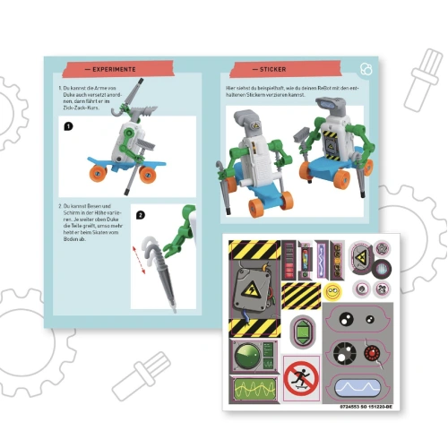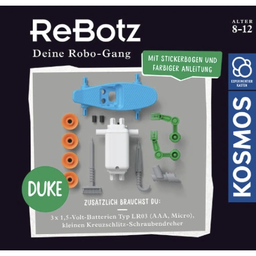 Ето го и готиният Дюк! Той вече тича с бясна скорост из стаята. Снабден с чадър, метла и скейтборд, Дюк е много специален. Просто следвайте ясните инструкции, инсталирайте двигателя и батериите и роботът ще започне да се движи. Дюк кара скейтборд по зигзагообразен курс – той е скейтърът от серията ReBotz, лудите роботи от сметището. ReBotz е робо-бандата от KOSMOS – 4 робота от сметището, които вдъхват нов живот на старите части, от които са сглобени. Със страхотни стикери, които правят ReBotz да изглеждат още по-шантави! Но какво се случва, ако крайниците на различните роботи се разбъркат безумно? Изненада! ReBotz обменят компонентите, от които са направени, помежду си – разбира се, това включва и непотребни неща като стари железа, ракети за тенис, чадъри и други подобни. Работи с батерии 3 x 1,5V тип LR03 (AAA, Micro).