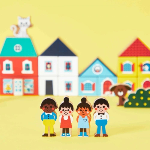 Каква ще бъде сградата днес – едноетажна или двуетажна? С цветен, заострен или плосък покрив? Възможностите са многобройни и всяка подредба води до нова история. Играта с дървените блокчета подпомага развитието на креативността, въображението и фината моторика. Подреждането, балансирането и комбинирането на различните форми развива координацията и пространственото мислене, като същевременно насърчава концентрацията и търпението.