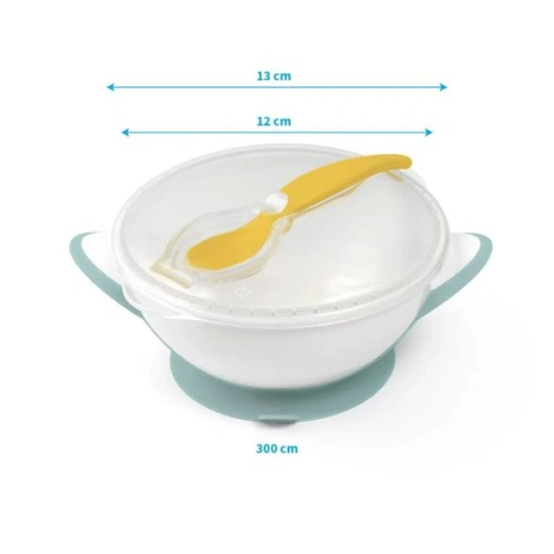 Купа с противоплъзгащо дъно и лъжица, удобна за употреба по време на разходка или пътуване.