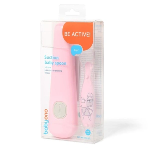 Розова силиконова бебешка лъжица с вакуумна основа в кутийка PAT70977