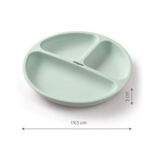 Тази чиния с вендуза е идеална, когато детето се учи да се храни самостоятелно. Благодарение на вендузата, вероятността от разливане или разсипване е силнио намалена. Ергономичната форма на продукта улеснява детето да хваща храната. Трите удобни отделения насърчават детето да опитва разнообразни хранителни продукти. Изработена от висококачествен силикон, чинията е безопасна за здравето и лесна за почистване. Може да се мие в съдомиялна машина и да се загрява в микровълнова фурна.