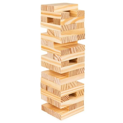 Комплектът включва дървени блокчета, които се нареждат в кула, след което играчите се редуват да премахват блокчета, без да съборят кулата.
