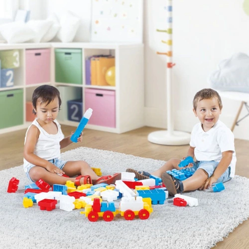 Комплект DOLU Мега блок– 25 цветни блокчета с букви и цифри, създадено за деца от 1 година нагоре. Удобните кубчета са лесни за сглобяване и разглобяване, стимулират ранното учене и въображението.