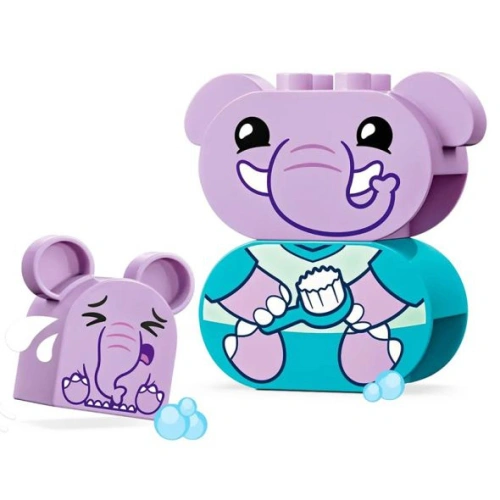 В комплекта децата ще открият 15 части - майка и бебе слонче, както и части, с които ще сглобят вана и душ! Слончето бебе е двустранно изрисувано - от едната страна е сърдито, а от другата личицето му е доволно. Децата ще се забавляват докато извършват ежедневните дейности по време на къпане.
