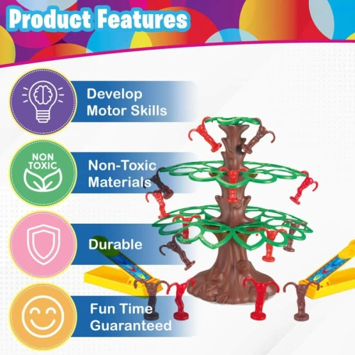 Пригответе се за смях, сръчност и състезателен дух с Jumping Monkeys – динамична игра за двама играчи, която развива координацията и бързината. Целта е проста, но предизвикателна: катапултирай всички свои маймунки върху дървото и победи!