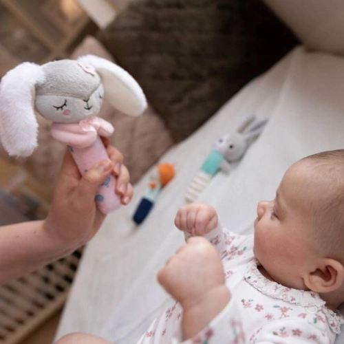 Бебешката плюшена играчка във формата на зайче е мека и писукаща. Този уникален продукт шумоли и писука дори при леко натискане. Бебето може да слуша звуците, издавани от играчката, да наблюдава цветовете и да изследва приятните на допир материали с различна текстура. То може да се научи да хваща и да играе с играчката. Играчката е лека и удобна за хващане от малките бебешки ръчички.