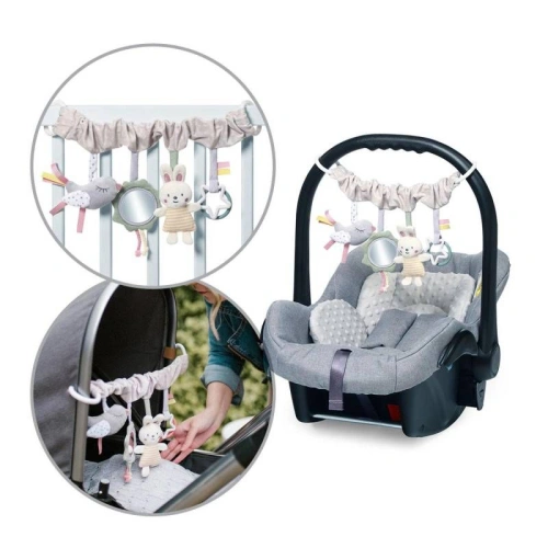 Закачащата се играчка, покрита с приятна на допир материя, е снабдена с птица с малка дрънкалка, безопасно огледало и стърчащи връвчици, шумолящ заек, както и пръстен и звезда. Внимателно подбраните части са увлекателни и привличат вниманието на бебето. Вашето мъниче може да играе, да открива света и да развива очите и слуха си.