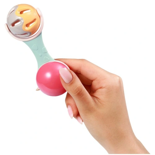 При разклащане дрънкалката издава фини звуци, които привличат вниманието на бебето и развиват слуха му