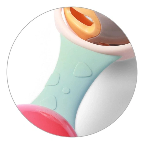 Благодарение на удобната структура на дрънкалката, бебето може лесно да я държи в малките си ръчички.