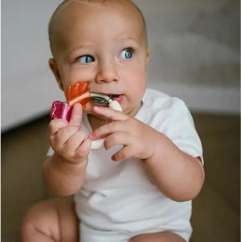 • Приятната на допир силиконова гризалка нежно трие венците на бебето и облекчава периода на никнене на зъби
