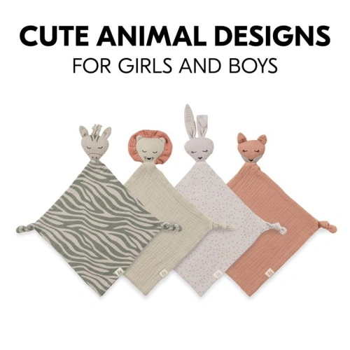 Бебешката кърпа се предлага в различни цветове и дизайни с животни като зебра, зайче, лъв и лисица.