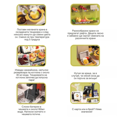 Играчката е подходяща за деца на възраст 3-5 години. Децата могат да мият храна, плодове и съдове, приготвят храна и напитки и изпълнят поръчката в кутия за вкъщи или на място. След това да я отбележат на касовия апарат, където клиентът да заплати “в брой” или с карта
