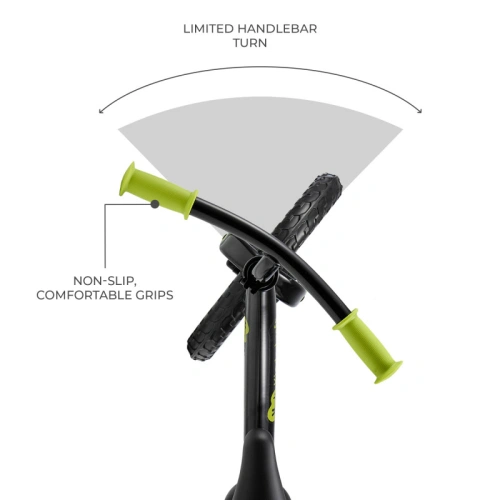 Ограничителят на обхвата на завъртане на кормилото предотвратява неволни движения, а гумените дръжки осигуряват по-добро сцепление за малките ръчички. Пластмасовите капачки с винтове предотвратяват наранявания. Конструкцията отговаря на изискванията на EN 71-1 и е тествана от TÜV Rheinland.