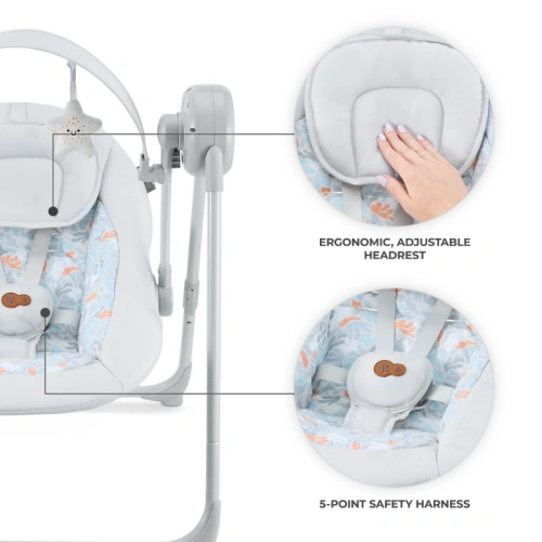 Ергономичната, регулируема облегалка за глава и 5-точковият колан с меки подложки осигуряват стабилна опора и безопасно позициониране. Вашето дете може да почива комфортно и безопасно – независимо дали се люлее или лежи неподвижно. Двете позиции на седалката– легнало и полулегнало – ви позволяват да адаптирате шезлонга към активността на вашето бебе. Идеален както за игра, така и за тиха почивка.