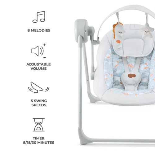 Функцията за люлеене ви позволява да избирате от 5 нива на скорост, за да отговарят на нуждите на вашето бебе. Таймерът (8, 15 или 30 минути) завършва сесията автоматично, поддържайки ритъма на бебето. SWINGEE разполага и с 8 вградени мелодии, 3 от които звуци от природата.