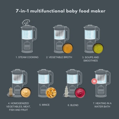 Оборудван е със 7 интегрирани функции за готвене на пара на зеленчуци, бобови растения, месо и риба, пасиране и нарязване, смилане, приготвяне на зеленчуков бульон, пюрета, супи, плодови смутита и бебешка храна. Може да се използва и за затопляне на храна на водна баня.