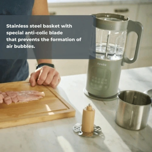 Новият уред за приготвяне и хомогенизиране на бебешка храна от Nuvita е оборудван с 3 специални остриета, които позволяват различни приготвяния (от нарязване до пюриране) с различни количества, консистенции и видове храна, за да се приготвят разнообразни ястия, подходящи за различните етапи на отбиване. Освен това, двойният контейнер позволява едновременното приготвяне на две различни храни: едната в стъкления буркан (с 2 сменяеми остриета) и едната в кошницата от неръждаема стомана, със специално острие против колики, което предотвратява образуването на въздушни мехурчета.