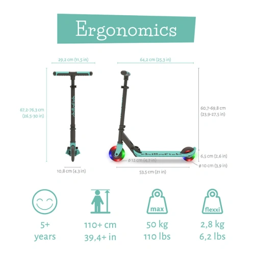 Flexxi е лека, лесна за транспортиране и се управлява лесно, където пожелаете! Скутерът има характерна двойна платформа с вградена крачна спирачка. Кормилото се сгъва с щракване без инструменти, за да можете лесно да вземете Flexxi със себе си при приятели или в парка. Просто отключете и сгънете, толкова е лесно!