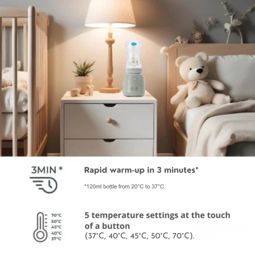 Бързо затопля шише само за 3 минути (на базата на шише от 120 мл от 20°C до 37°C) и поддържа температурата приблизително 4 часа.