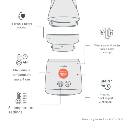 Преносимият нагревател за шишета Mix70 от Nuvita революционизира начина, по който млякото се затопля извън дома, благодарение на две уникални характеристики: