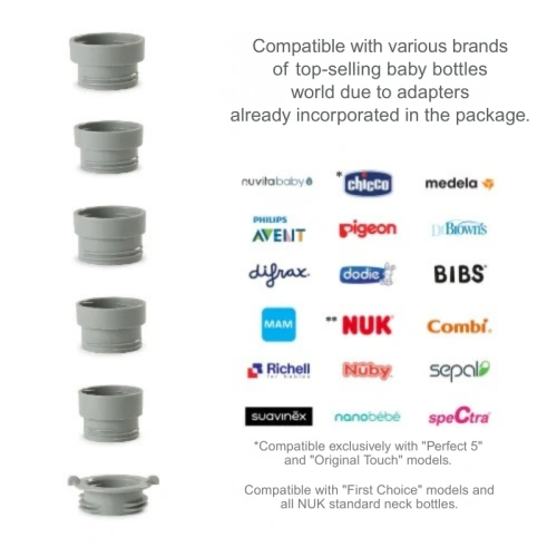 Mix70 от Nuvita е съвместим с всички основни модели и марки шишета, благодарение на 6-те адаптера, включени в комплекта*.