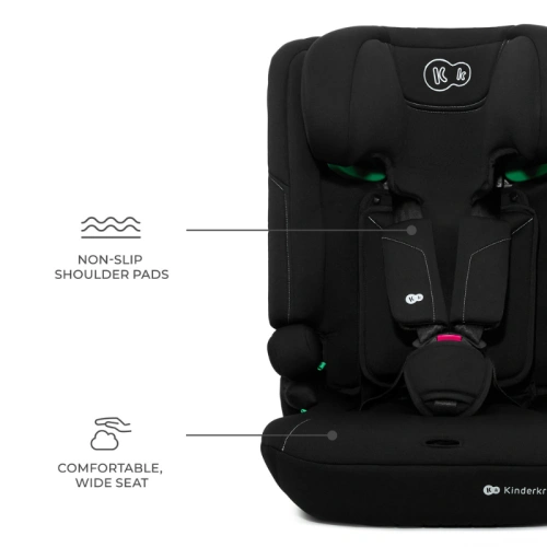 Широка, удобна седалка, 5-точкови предпазни колани с меки протектори и противоплъзгащ слой върху раменните възглавнички гарантират стабилно позициониране на детето и пълен комфорт по време на употреба.