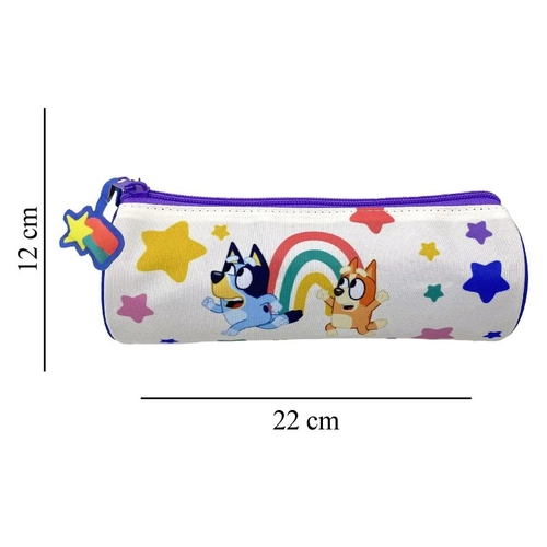 BLUEY Многоцветен несесер за училище Превърнете ученето в забавление с Bluey. Този ярък, многоцветен, с цилиндричен дизайн несесер , който привлича вниманието с изображения на Bluey и Bingo, е идеалният спътник за всяко дете в предучилищна възраст. Цип с висулка на звезда за лесно отваряне. Напълно подплатен и омекотен интериор за допълнителна издръжливост. Включва етикет за идентификация на собственика. Със забавен дизайн и практични функции, това ще бъде любим аксесоар за всеки малък фен на веселата поредица Bluey.