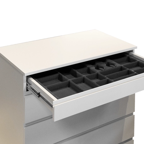 той разполага с пет просторни чекмеджета с механизъм за плавно затваряне. Най-горното чекмедже е снабдено с практичен органайзер за колани,