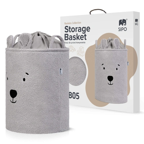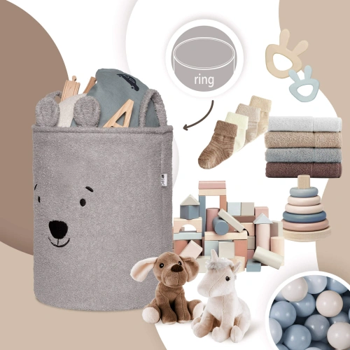 С капацитет от 43 литра кошът е подходящ за използване в детска стая, хол, спалня или баня, като осигурява удобно съхранение на играчки, текстил и аксесоари, без да заема излишно пространство. Външният слой е изработен от мек, пухкав букле плат, който естествено приканва към допир и взаимодействие. Приветливият дизайн с животински мотив – сивото мече – помага за изграждане на емоционална връзка с продукта и превръща подреждането в забавление, а не в задължение.