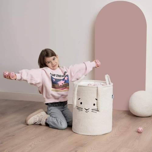 С капацитет от 43 литра кошът е подходящ за използване в детска стая, хол, спалня или баня, като осигурява удобно съхранение на играчки, текстил и аксесоари, без да заема излишно пространство. Външният слой е изработен от мек, пухкав букле плат, който естествено приканва към допир и взаимодействие. Приветливият дизайн с животински мотив – очарователното зайче – помага за изграждане на емоционална връзка с продукта и превръща подреждането в забавление, а не в задължение.