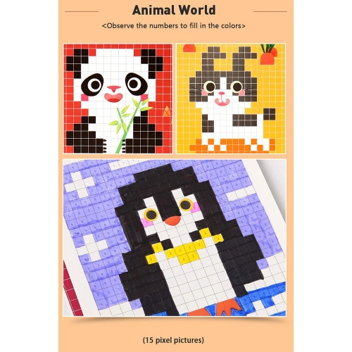 JA91425 Пиксел арт книжка за оцветяване, Животни е идеален избор за занимание у дома, в училище или като подарък за малки любители на рисуването и животните.