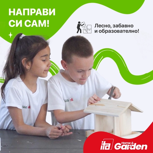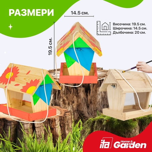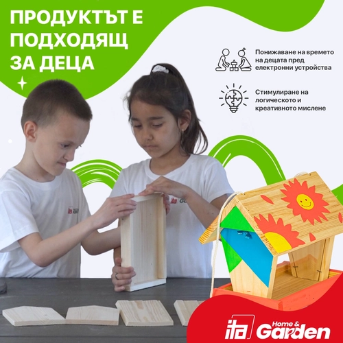 Креативен комплект Хранилка за птички сглоби и оцвети FlybyFeeder, 14,5x20x19,5см позволява на децата да се забавляват, да се учат и играят. С нея всяко дете ще прояви своето творчество, умения и фантазия. Може би детето ще има нужда от Вашите помощ и напътствия при сглабянето, но оцветяването оставете изцяло на неговата креативна мисъл. Всяка хранилка за птички е изработена от естествена иглолистна дървесина и в комплекта получавате всичко необходимо, за да сътворите произведение на изкуството, да дадете воля на въображението на децата и да внесете частица от природата близо до себе си. След сглабянето и оцветяването остава само да закачите готовата хранилка някъде на балкона или в двора си, а защо не и на някое дръвче в парка. Детето Ви ще остане истински щастливо и доволно, че е направило само хранилка, която да радва малките обитатели на природата.