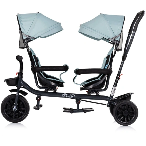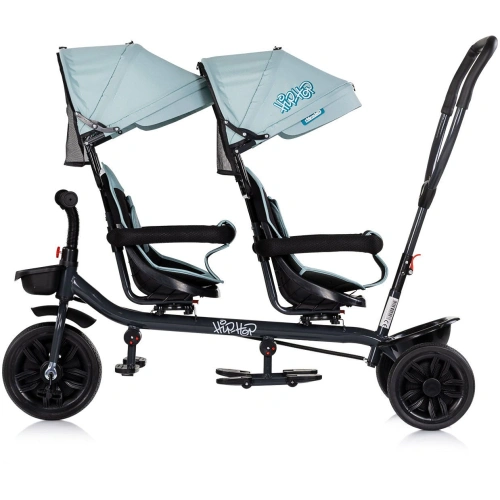 Мултифункционалната триколка за близнаци от Chipolino - Хип Хоп е идеалното решение за семейства с две деца на възраст над 1.5 години. Моделът е проектиран да улеснява родителите и да осигурява комфорт и безопасност на двете мъници едновременно. Издържа общо тегло до 40 kg и предлага две възможности за използване - родителят може да бута децата с удобната дръжка или детето отпред да задвижва триколката самостоятелно с педалите.