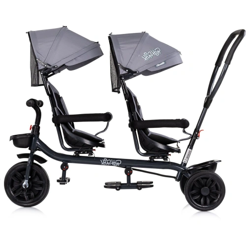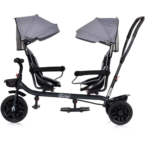 Мултифункционалната триколка за близнаци от Chipolino - Хип Хоп е идеалното решение за семейства с две деца на възраст над 1.5 години. Моделът е проектиран да улеснява родителите и да осигурява комфорт и безопасност на двете мъници едновременно. Издържа общо тегло до 40 kg и предлага две възможности за използване - родителят може да бута децата с удобната дръжка или детето отпред да задвижва триколката самостоятелно с педалите.