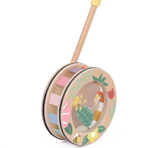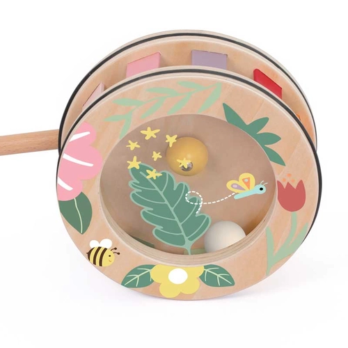 Тази стилна дървена играчка за бутане впечатлява с нежния си горски дизайн и внимателно подбраната цветова палитра. Колелото е декорирано с илюстрации на листа, цветя, пеперуда и пчеличка, които създават усещане за природа и спокойствие.