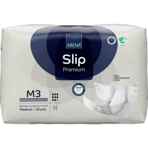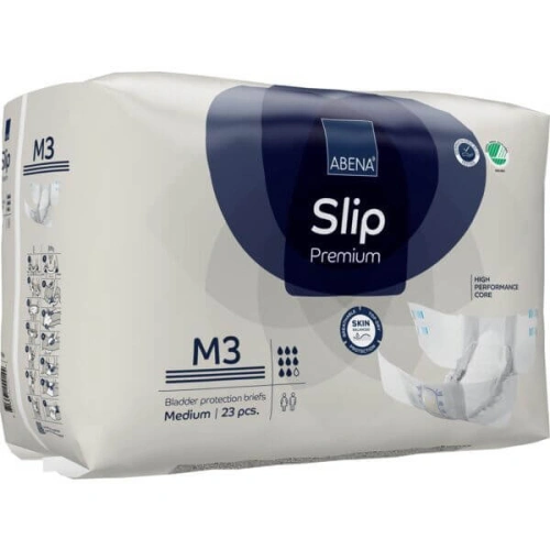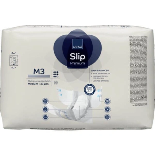 Еко пелени / памперси за инконтиненция и нощно напикаване Abena Slip Premium, размер М3 са пелени "всичко в едно" предназначени специално за юноши, младежи и възрастни с ханш от 70 до 110см., които страдат от бързо и неконтролирана, умерена до тежка инконтиненция / уриниране и нощно напикаване, създадени за да осигурят оптимална защита чрез високо качество и функционалност. Размер М3, 23 броя в опаковка, размер на пелената 67х82см.