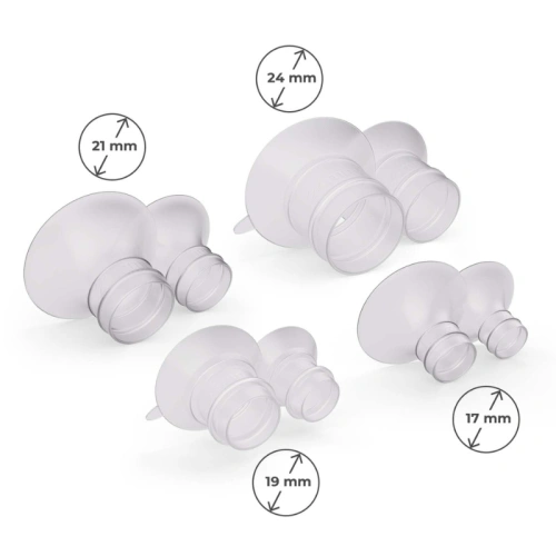 В кутията ще намерите 5 различни размера фунии, така че лесно можете да ги съобразите с гърдите си и да подобрите комфорта по време на изцеждане. Малка промяна може да направи голяма разлика. Изберете един от 5-те размера фунии - 27 мм, 24 мм, 21 мм, 19 мм и 17 мм - и се насладете на ефикасно и удобно изцеждане.